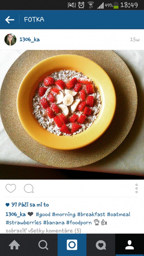 Na fotke pod textom môžte vidieť jedny z najjednoduchších raňajok. Ovsenú kašu s ovocím. Keďže som alergická na kravskú bielkovinu a nemôžem mlieko, cottage, tvaroh, jogurty atd. používam buď kokosové, sójové alebo mandľové mlieko. V tomto prípade som vločky zaliala len horúcou vodou a počkala kým nezmäkli. Na vrch som poukladala nakrájaný banán a jahody (moja najobľúbenejšia kombinácia) a zapriala si len dobrú chuť:)